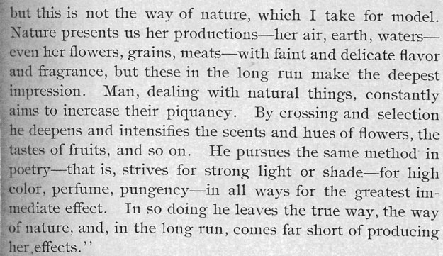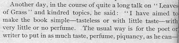 Then he said: ” I often read them aloud to myself: I like to read them in a palpable voice: I try my poems that way—always have: read them aloud to myself: I seem to get a new angle on them—see things I could not see in any other way. [italics added]